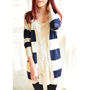 2014春新款 日式森女风宽条纹中长款百搭显瘦针织衫开衫外套 女 /