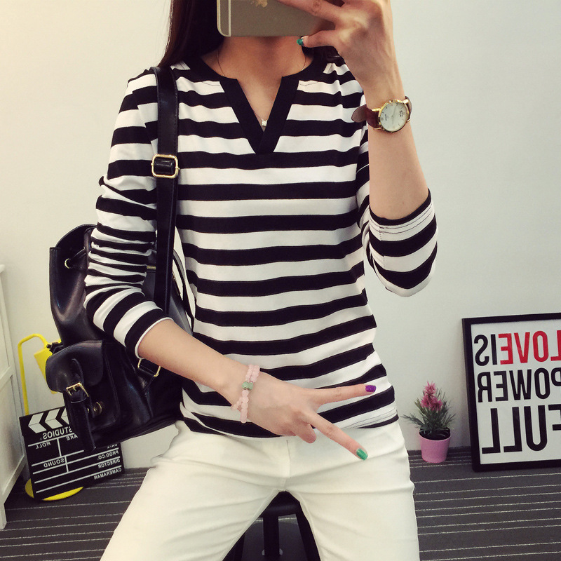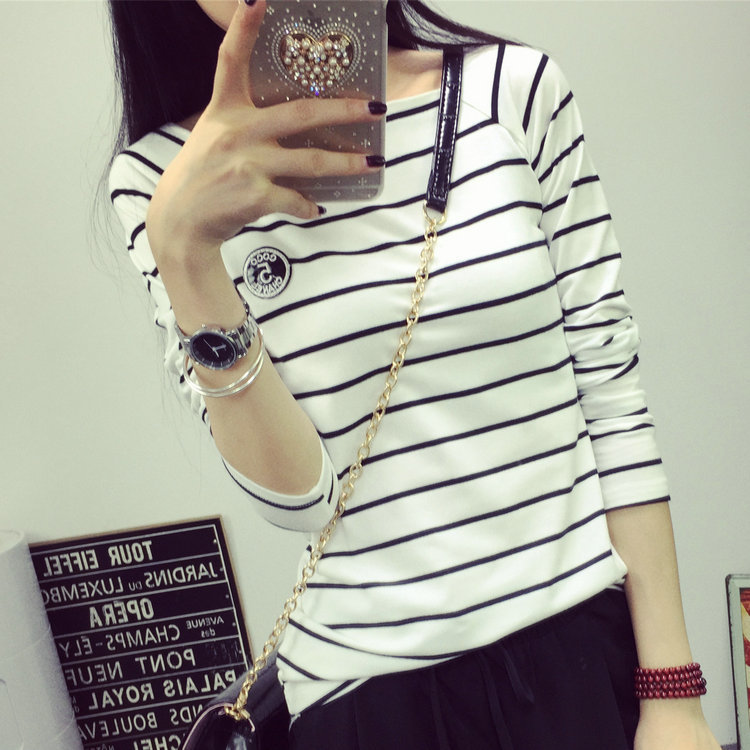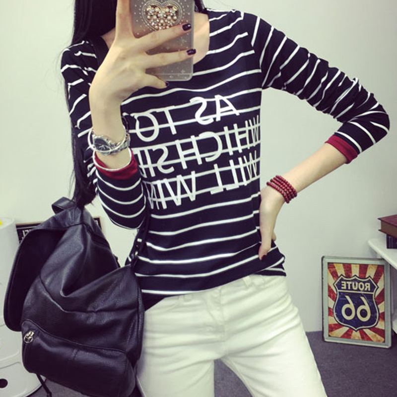 2015秋季女装纯棉打底衫 韩版显瘦条纹长袖t恤女 一件代发 /