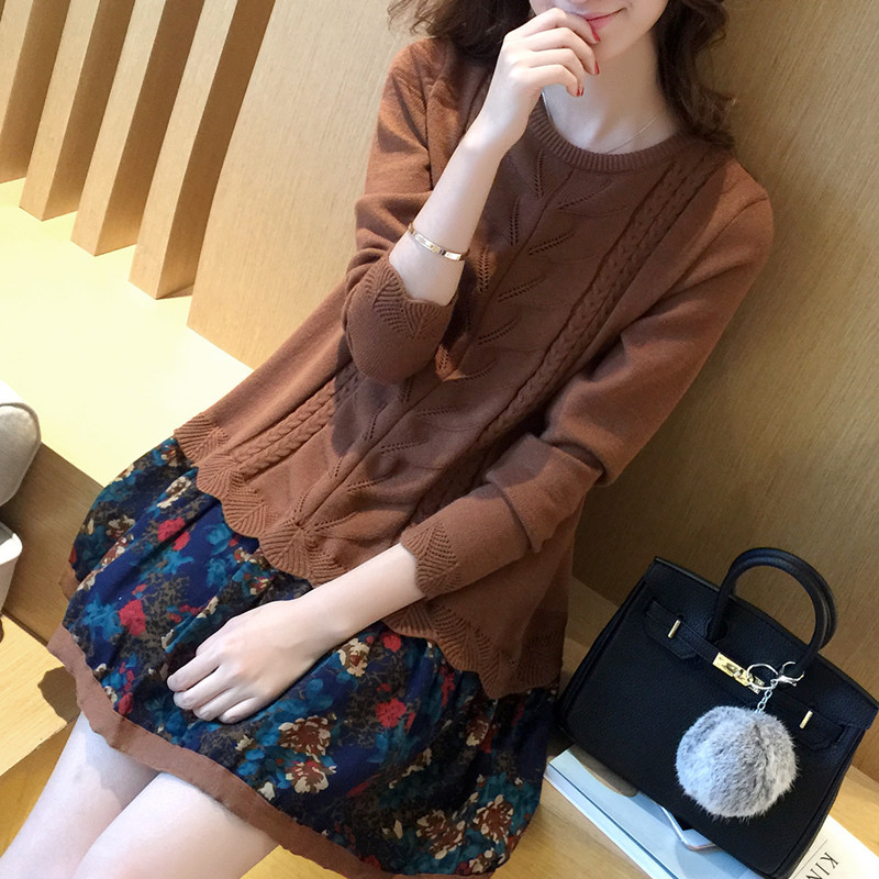 实拍2015秋冬新款圆领中长款针织衫毛衣下摆拼接毛衣连衣裙 /