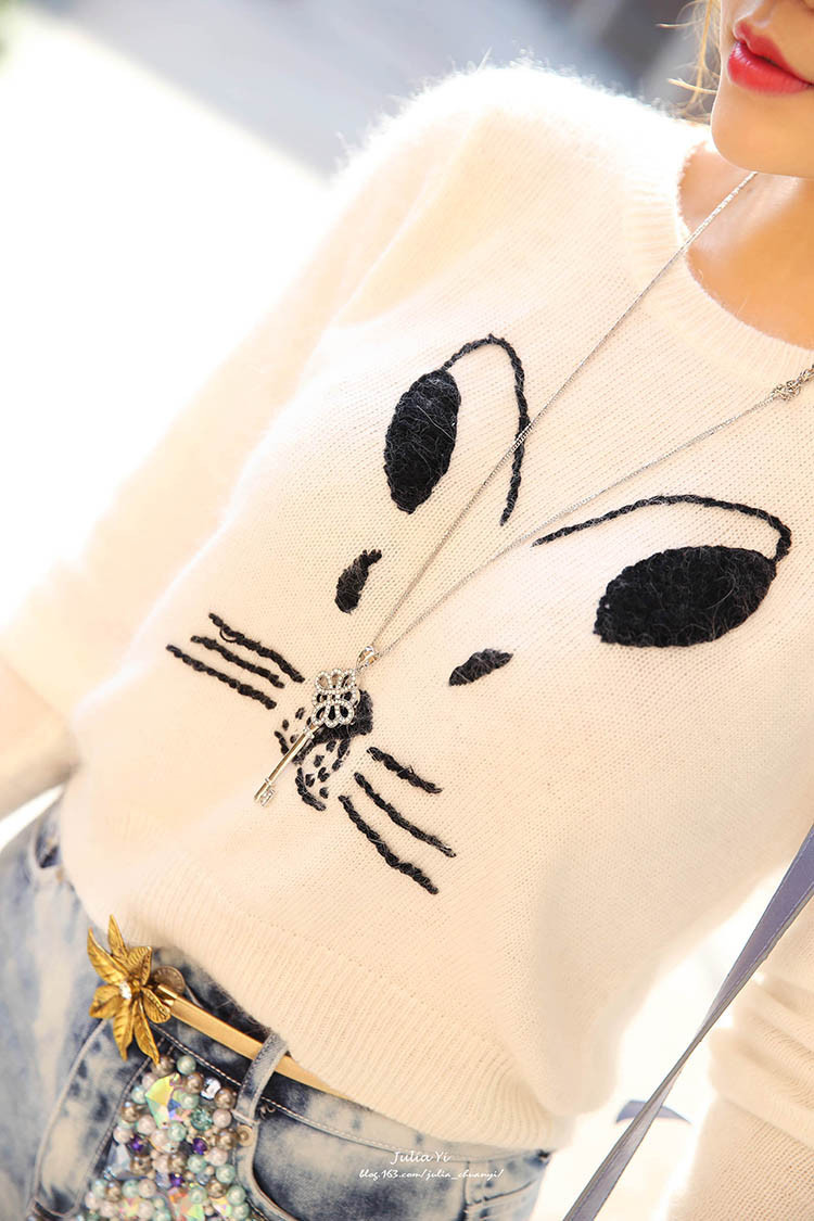 2015秋冬新品T0PSH0P超萌可爱刺绣小兔子纯白兔毛套头针织毛衣女 /