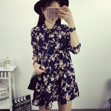 2016新款夏装V领蝴蝶结系带A字雪纺裙宽松碎花打底连衣裙 /