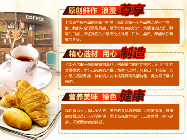 卡洛克烘焙选取一级新鲜食材原料,搭配精益的烘焙技术,运用**的套餐模式,烹饪出**的产品。色香味上乘,勾勒出“卡洛克”的产品的**形象,神秘诱人的卡洛克韩国风情特色,促使同行难以模仿。