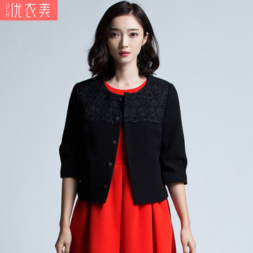 优衣美2016春季女装圆领时尚七分袖蕾丝拼接小香风短外套女16103 /