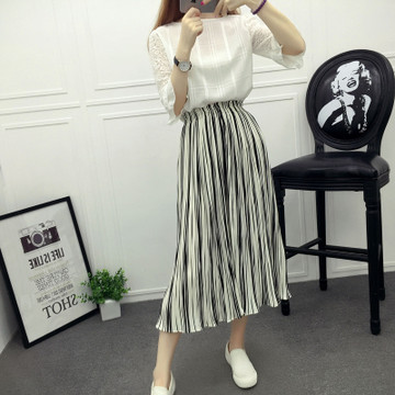 夏季新款时尚高腰雪纺阔腿裤复古百搭休闲裤百褶条纹九分裤裙 /