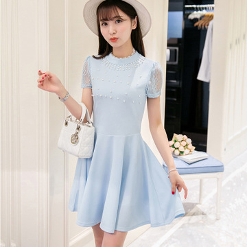 夏季新款时尚小香风蕾丝短袖拼接中长款连衣裙修身显瘦大摆a字裙 /