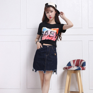 年新款显瘦女神牛仔半身裙包臀迷你裙女休闲破边深色半身短裙 /